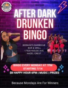Get ready for a wild twist on your favorite game night! Join us every Monday for After Dark Drunken Bingo — where the drinks are flowing, the music is bumpin’, and the bingo gets a little rowdy. Hosted by a rotating lineup of the baddest babes, this weekly party is not your grandma’s bingo.